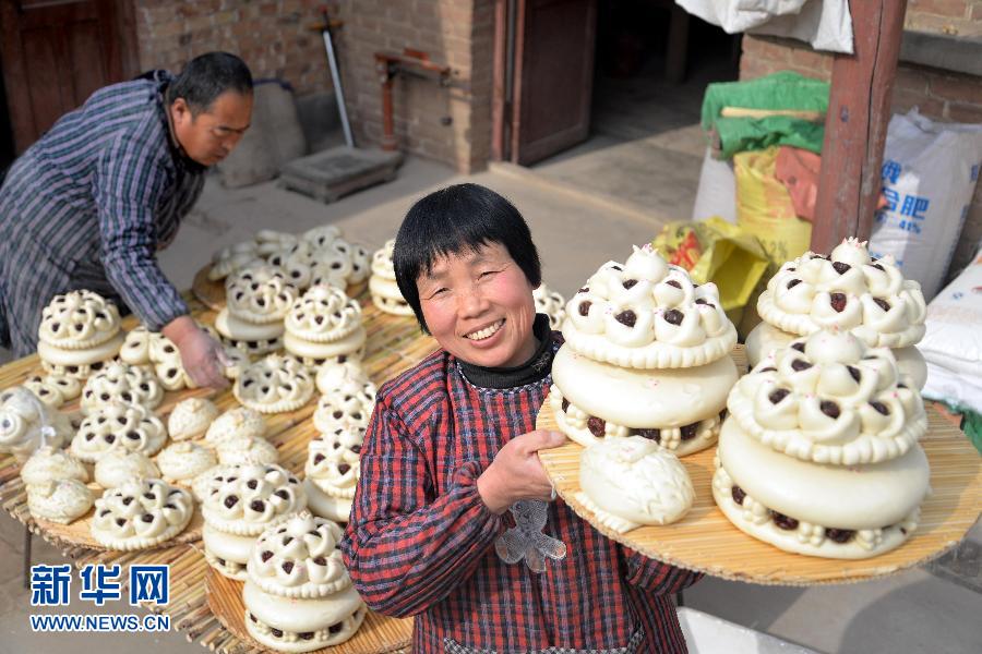 2月6日,在山东省茌平县堤头袁村,村民袁晓荣(右)在展示蒸熟的花糕。春节临近,山东省茌平县贾寨镇堤头袁村村民穆广友和袁晓荣夫妇就开始忙活起花糕生意。他们做的各式各样的花糕、花馍等俏销当地,不但增加了经济收入,同时也为新春增添浓浓的年味。在山东鲁西地区有春节蒸花糕、花馍的习俗,当地农民用红枣和面粉制作成花糕、花馍和面刺猬、枣花等面食,寓意生活一年比一年好,迎接农历新年的到来。新华社发(赵玉国 摄)