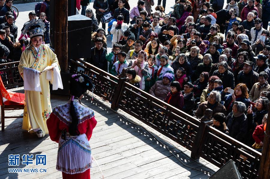 2月8日,游客在观看塘栖古镇上的传统越剧演出。临近春节,传统民俗年味迎新春活动在浙江杭州塘栖古镇举办,活动将持续至农历正月十五。除听古戏、打年糕、磨米粉、送春联等多项传统民俗活动外,还有多种江南民俗表演,以及跳绳、滚铁环、打陀螺等儿时游戏。杭州塘栖古镇历史悠久,始建于北宋,繁盛于明清。京杭大运河穿镇而过,是远近闻名的“鱼米之乡”“丝绸之府”。 新华社记者 徐昱 摄