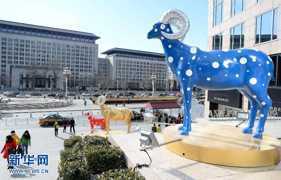 2月8日,行人从北京东方君悦大酒店前的羊雕塑旁走过。羊年春节临近,一座大型羊造型景观近日亮相北京东方广场,在东方君悦大酒店台阶两侧,也设置了8只彩色雕塑羊,营造了浓浓的节日气氛。新华社记者 陈晔华 摄