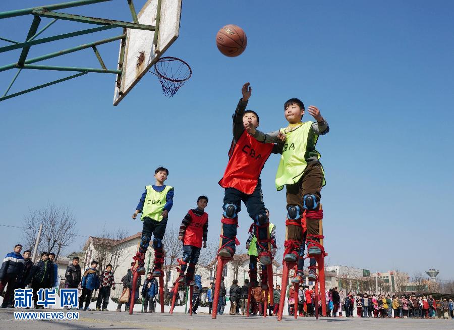 2月8日,河南省沁阳市山王庄镇万北小学花样高跷社团的孩子们在表演“高跷篮球”。当日,河南省沁阳市山王庄镇万北小学花样高跷社团的孩子们,表演“高跷跳绳”“高跷秧歌”“高跷足球”“高跷篮球”等节目,喜迎即将来临的新春佳节。新华社发(杨帆 摄)