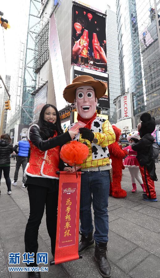 2月7日,在美国纽约时报广场,一名女青年向装扮成动画人物的纽约市民赠送新年红包。当日,一场名为“欢庆中国年”的活动在纽约时报广场举行。 新华社发