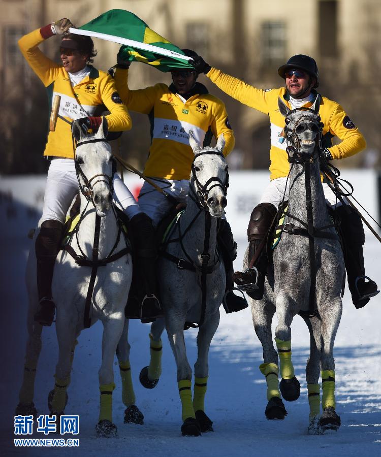 2月8日,巴西队三名选手手持国旗庆祝夺冠。当日,在天津环亚国际马球会举行的2015富国高银雪地马球世界杯决赛中,巴西队以11比5战胜美国队,夺得冠军。 新华社记者岳月伟摄