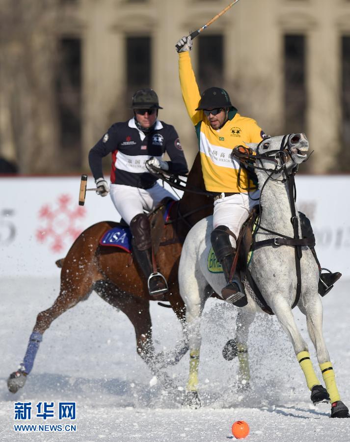 2月8日,巴西队选手吉列尔梅·林斯(右)在比赛中击球。当日,在天津环亚国际马球会举行的2015富国高银雪地马球世界杯决赛中,巴西队以11比5战胜美国队,夺得冠军。 新华社记者岳月伟摄