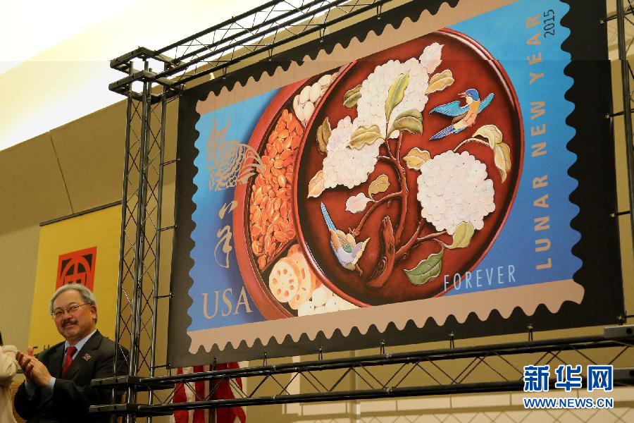 当日,美国邮政局为庆祝即将到来的农历羊年发行羊年生肖邮票,并在旧金山唐人街中华文化中心举行首发仪式。美国邮政总局从1993年开始发行中国生肖邮票,最新羊年邮票是第二套中国生肖邮票系列中的第八枚。新华社发(刘艺霖摄)