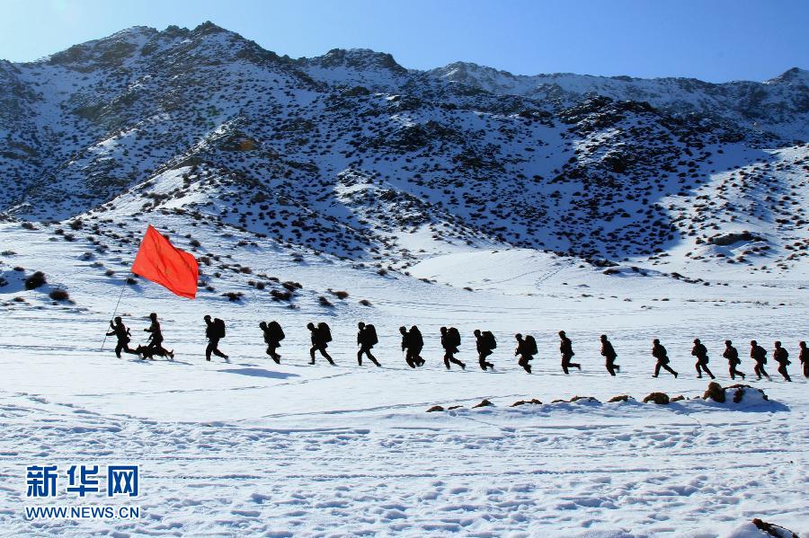 2月7日,博尔塔拉蒙古自治州公安边防支队机动部队官兵在野外拉练途中。 2月7日,新疆博尔塔拉蒙古自治州公安边防支队机动部队官兵来到边境山区的陌生环境,冒着零下二十摄氏度的严寒开展野外拉练。拉练过程中设置了雪地突击、野外狙击、雪地耐寒等训练课目,以此锤炼、检验部队在野外极寒条件下快速反应和反恐处突能力。新华社发(张佳 摄)