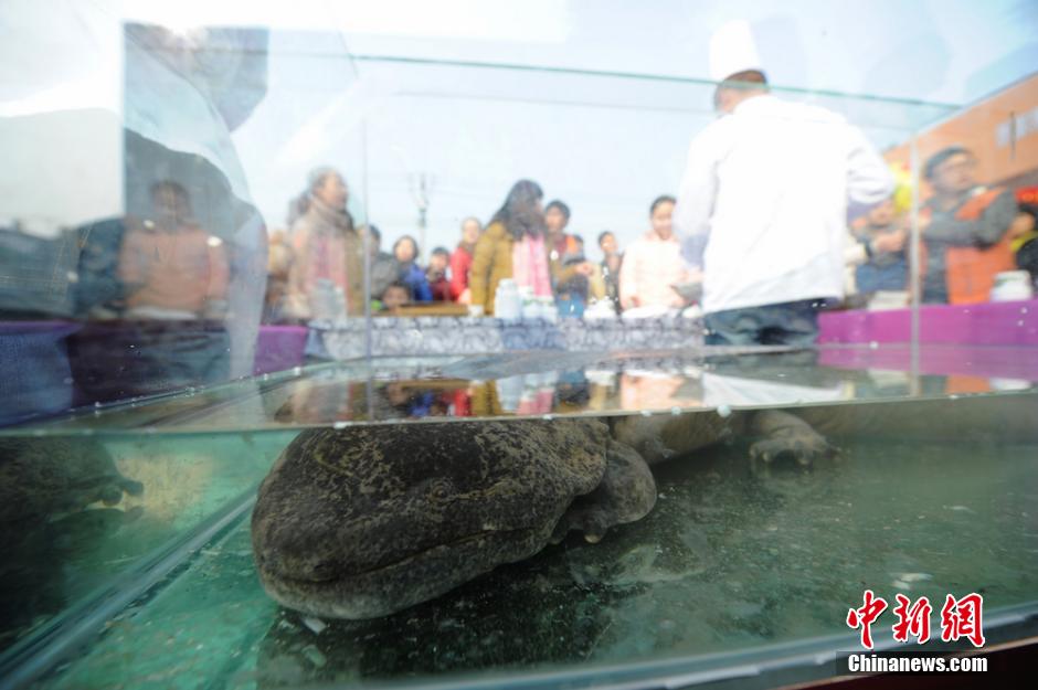 2月6日,大鲵养殖厂老板在湖南张家界街头摆起了三日流水宴,免费请市民吃人工养殖的“娃娃鱼”,吸引了众多市民品尝。 杨华峰 摄