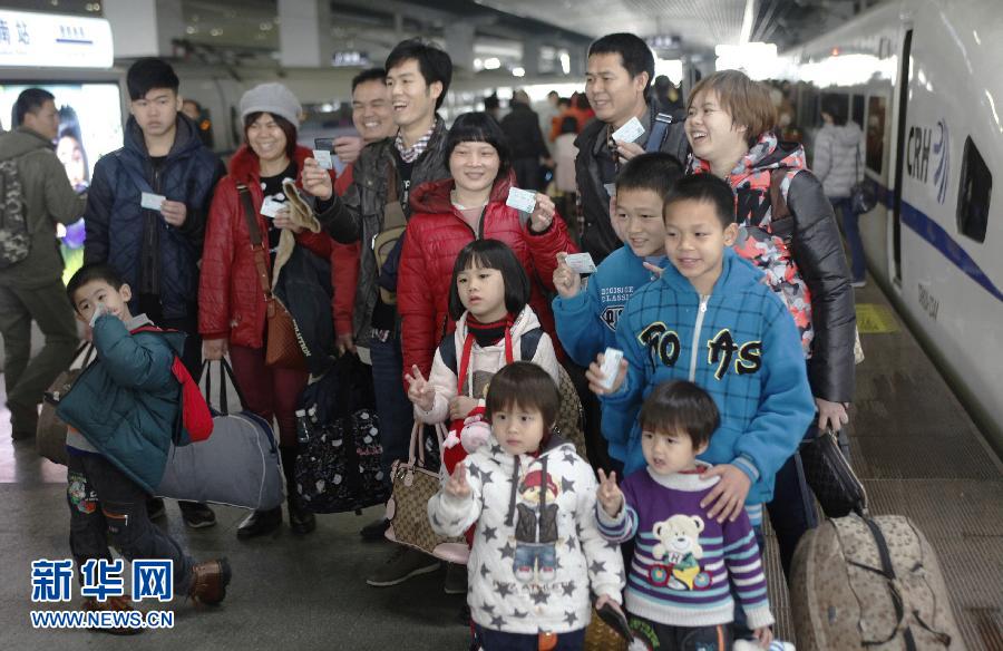 2月7日,在广州南站站台上,乘客在D4602次列车前留影。当日10时15分,满载600多名外来务工人员的的D4602次动车组列车从广州南站开出,驶往广西南宁。这是广铁集团2015年春运开行的首趟外来务工人员动车专列。新华社记者 王申 摄