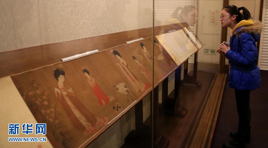 2月7日,参观者在观看展出的国宝级珍品、唐朝《簪花仕女图》。当日,国宝级珍品《簪花仕女图》等39幅仕女图亮相辽宁省博物馆。这个名为《横翠含丹》的中国古代仕女画展向观众展示了晋、唐、宋、元、明、清各个时期仕女的穿着时尚及生活仪态。新华社记者 姚剑锋 摄