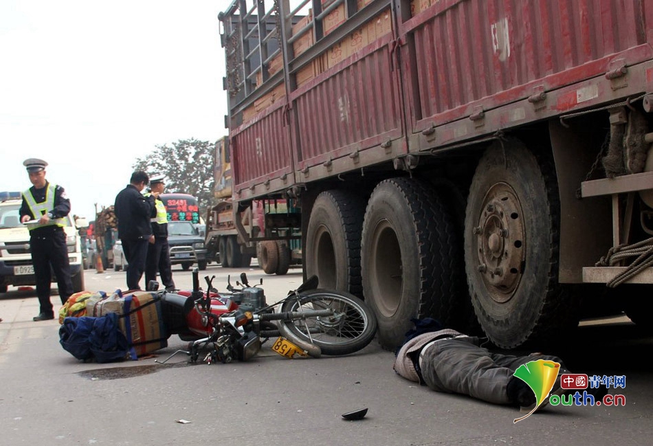 黄某驾车行驶至藤州镇礼秀村路口时,与横穿公路的老人廖某擦碰,造成廖某倒地被大货车碾压。黄某当时正驾车驶往广西平南县。图为事发现场。