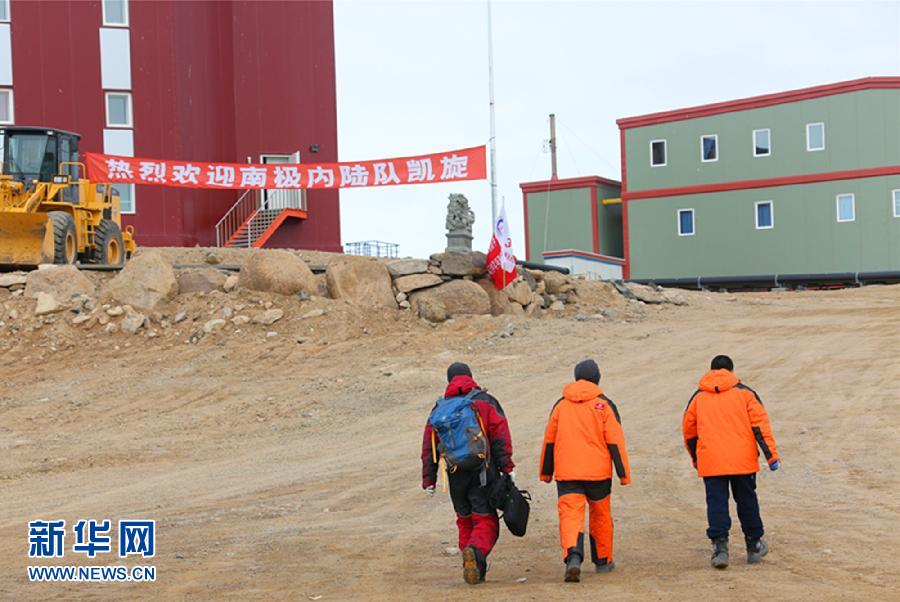 当地时间2月7日上午,返回中山站的内陆队队员从欢迎横幅旁走过。当日,自2014年12月中旬奔赴南极内陆昆仑站工作的中国第31次南极科考队内陆队圆满结束任务凯旋,返回到中山站大本营。 新华社记者白阳 摄