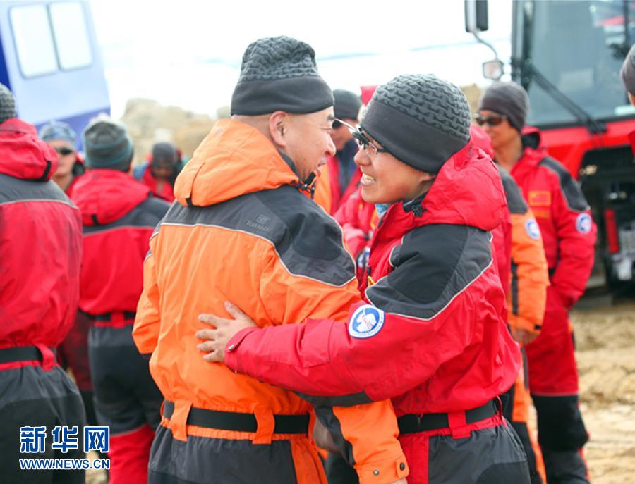 当地时间2月7日上午,留守中山站的科考队员与内陆队队员热情拥抱。当日,自2014年12月中旬奔赴南极内陆昆仑站工作的中国第31次南极科考队内陆队圆满结束任务凯旋,返回到中山站大本营。 新华社记者白阳 摄