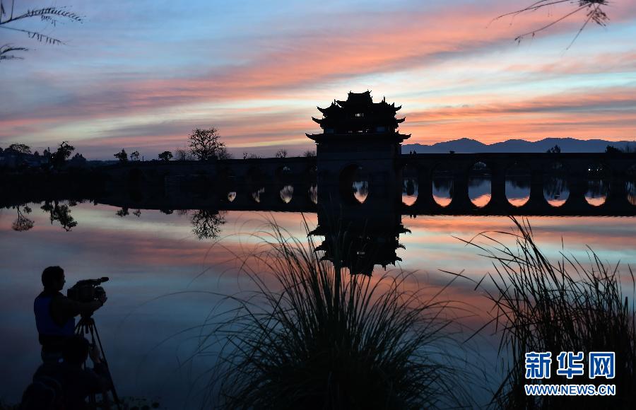 2月7日,一名摄影师在拍摄云南建水十七孔双龙石拱古桥日出景色。初春时节,中国历史文化名城云南省建水县风和日丽,有着深厚历史文化积淀的古临安府故址、团山古村群落、双龙古桥风景区、燕子洞、古文庙等风景名胜区迎来了大批中外旅游者。新华社记者陈海宁摄