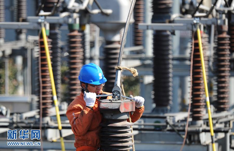 2月5日,江苏省电力公司扬州检修分部职工在扬州市瓜洲镇镜内的220千伏古渡变电站内检修电网设备。为确保节前生产生活和春节期间安全用电,扬州供电企业在对43个重要用电户开展安全用电检查的同时,近日派出数十个运行和检修联合专业组,对辖区的162座35千伏以上变电站及其进出线路开展白天、夜间用电高峰时段的特巡和红外测温,消除电网隐患。新华社发(濮良平 摄)