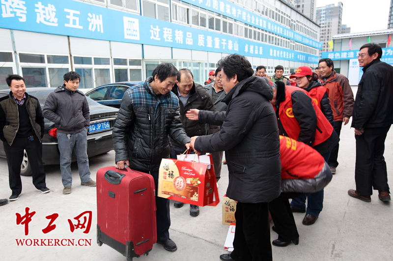 2月7日至9日,中建二局三公司西城区大吉片公建C、D地块项目工会主席张长春为返乡农民工送上慰问品,并为他们租了“返乡大巴”,送农民工奔赴火车站。据张长春介绍说,项目高峰时有1200人,农民工此前已经陆续返乡,临近过节差不多有300人集中返乡。目前该建筑项目工地目前已进入年前收工阶段。  中工网记者 李雪峰 摄