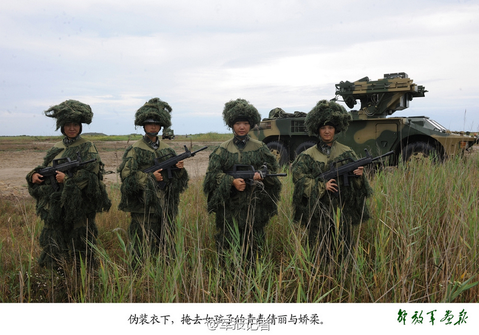 图为在滩涂芦苇荡,解放军女子导弹搜索发射连队员着伪装衣在导弹发射车前合影。图片来源:解放军报法人微博