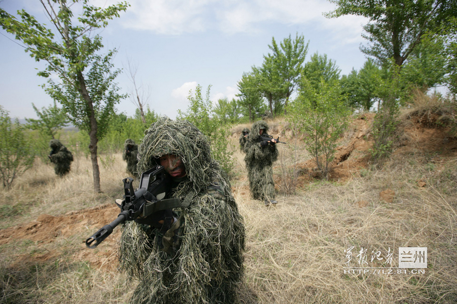 图为在大西北绿树枯草土丘间,兰州军区某部特种兵身着吉利服交替掩护进行野战搜索。图片来源:军报记者网