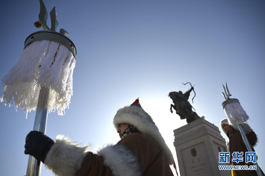 2月11日,来自内蒙古巴彦淖尔市乌拉特中旗的蒙古族牧民参加祭火迎春仪式。