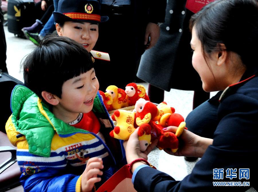 2月11日,郑州东站铁路工作人员为一名小朋友送上羊年吉祥物。 新华社记者朱祥 摄