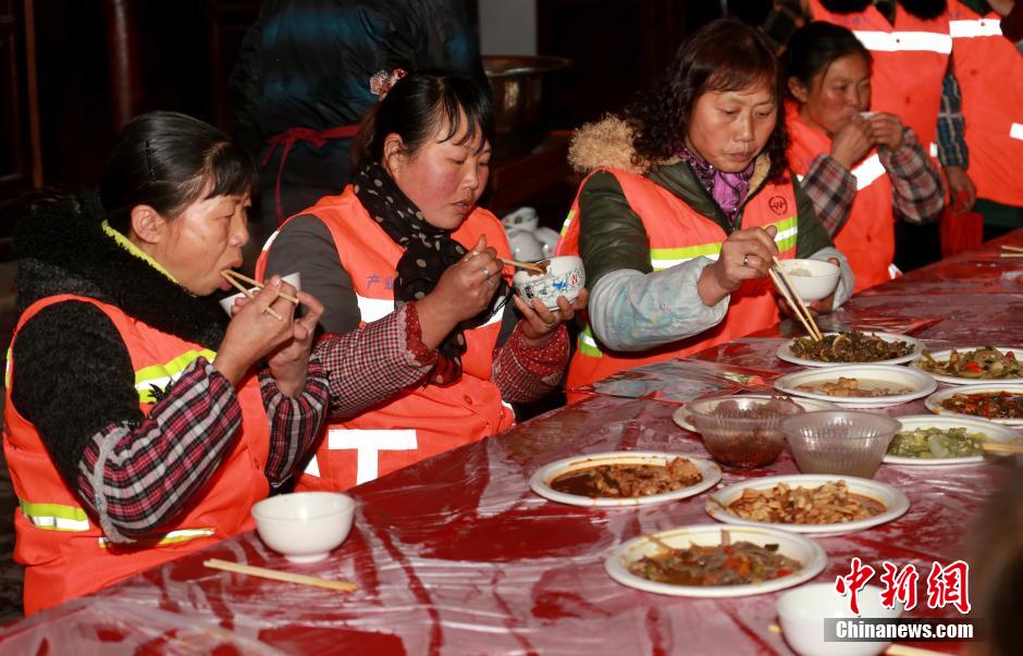 2月10日,贵州省安顺市一商家为了感谢环卫工人一年的辛苦,特设千人长桌宴,免费宴请1000名环卫工人。 中新社发 卢维 摄 图片来源:CNSPHOTO
