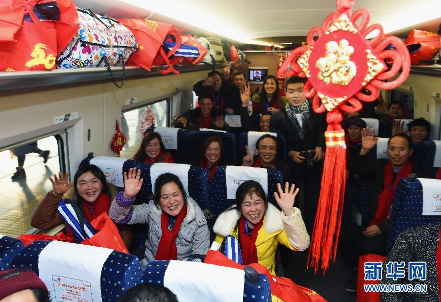 当日,由湖北省广播电视台、湖北省总工会、武汉铁路局等单位联手开行的免费农民工专列——D5996次动车组从武汉站驶出,500多名在武汉务工的农民工携带子女,乘坐免费动车专列回恩施、利川、宜昌等地,当天便能与亲人团聚过小年。新华社记者 肖艺九 摄