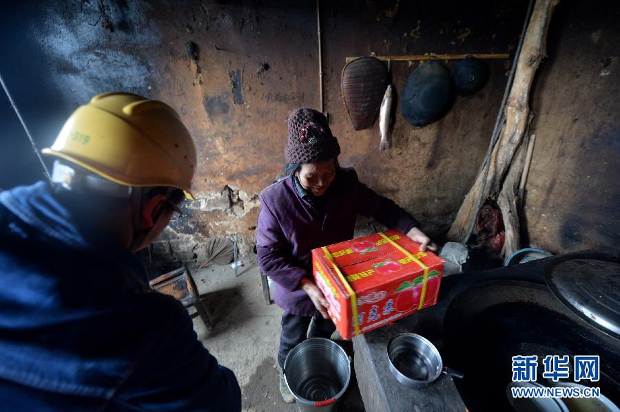 2月10日,供电所的工作人员将带来的年货送到麻风病村居民家中。在壶瓶山境内的剩头山上,坐落着一座20世纪50年代初建成的麻风病村,至今仍居住着19名已经康复的麻风病患者。这些人平均年龄在70岁以上且大多都有肢体残疾行动不便。新华社记者 白禹摄