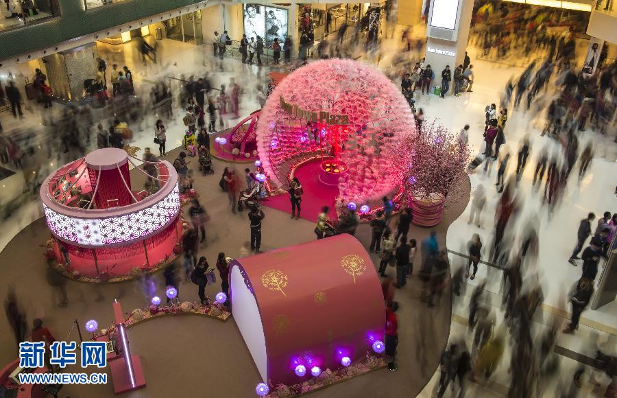 2月15日,市民在香港沙田的一家商场购物、拍照。农历羊年春节临近,人们纷纷外出办年货、逛花市,香港处处洋溢着喜庆的节日气氛。 新华社记者 何靖嘉 摄