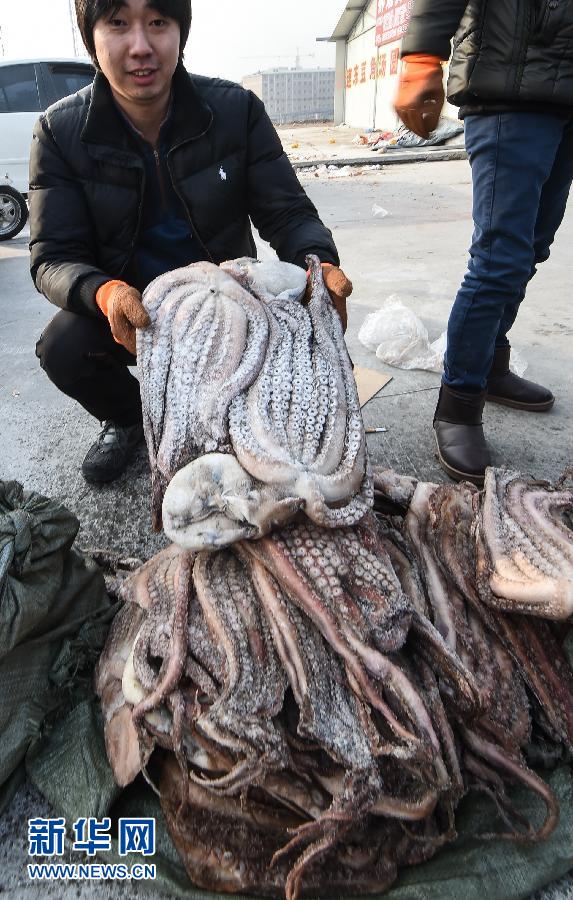 2月16日,吉林省延吉市兴安村大集上,一名商贩在展示从朝鲜罗先进口的章鱼。新华社记者 王昊飞摄