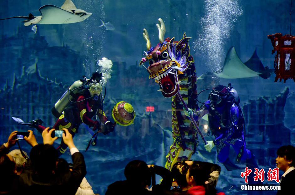 2月16日,北京海洋馆举办了2015年度海洋民俗首演活动。现场,北京海洋馆精心策划编排的全国首个海洋民俗表演首次向公众进行展示,醒狮祥龙同台斗秀。通过“缸内舞龙、缸外舞狮,游龙戏珠、狮随珠走”的形式,为游客营造了时空穿越般的奇幻享受。 中新社发 陆欣 摄