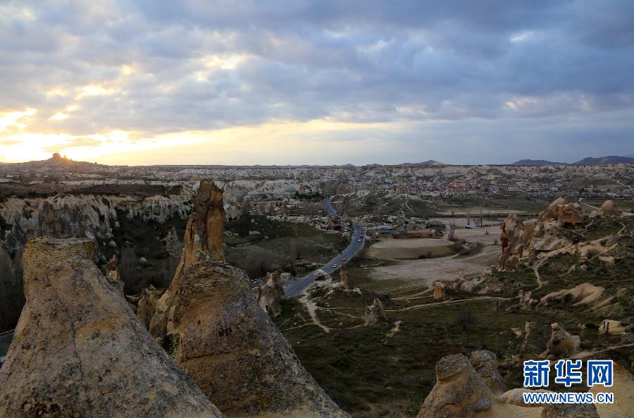这是2月14日拍摄的土耳其内夫谢希尔省卡帕多基亚“月球地貌”美景。卡帕多基亚位于土耳其中部安纳托利亚高原,曾被美国《国家地理》杂志评为全球最美的十个地方之一,以锥状火山岩“神仙烟囱”、可容纳万人的“地下城”和热气球旅游闻名。当地格雷梅国家公园和卡帕多基亚石窟群1985年被联合国教科文组织列入《世界遗产名录》。来自世界各地的许多游客都选择乘热气球升空鸟瞰,在晨曦和日暮中感受大自然的瑰丽神奇与人类文明的神工鬼斧。新华社记者邹乐摄