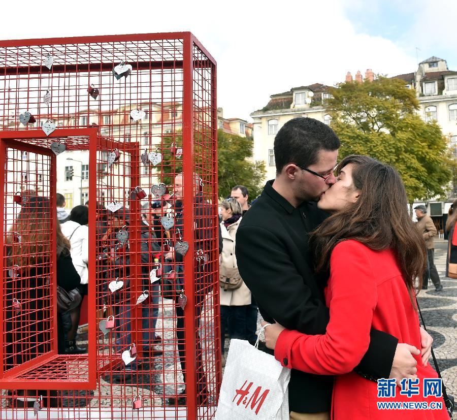 2月14日,在葡萄牙里斯本罗西奥广场,情侣参加“爱在里斯本”公益活动。  当日,一场名为情人节“爱在里斯本”的公益活动在葡萄牙首都里斯本市中心的罗西奥广场举行。情侣们花3欧元(约合21元人民币)便可从活动志愿者手中购买一把爱心锁和心形名牌,写上对爱人的甜言蜜语,锁在象征爱情的金属雕塑上。这一慈善活动将持续一个月,出售爱心锁所得全部善款将被转至莫桑比克一家医院,用于帮助那些身患心脏疾病而无力承担手术费的儿童。   新华社记者张立云摄
