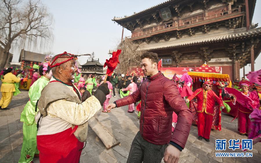 2月16日,在天津蓟县独乐寺庙会上,一位外国青年扭起了秧歌。