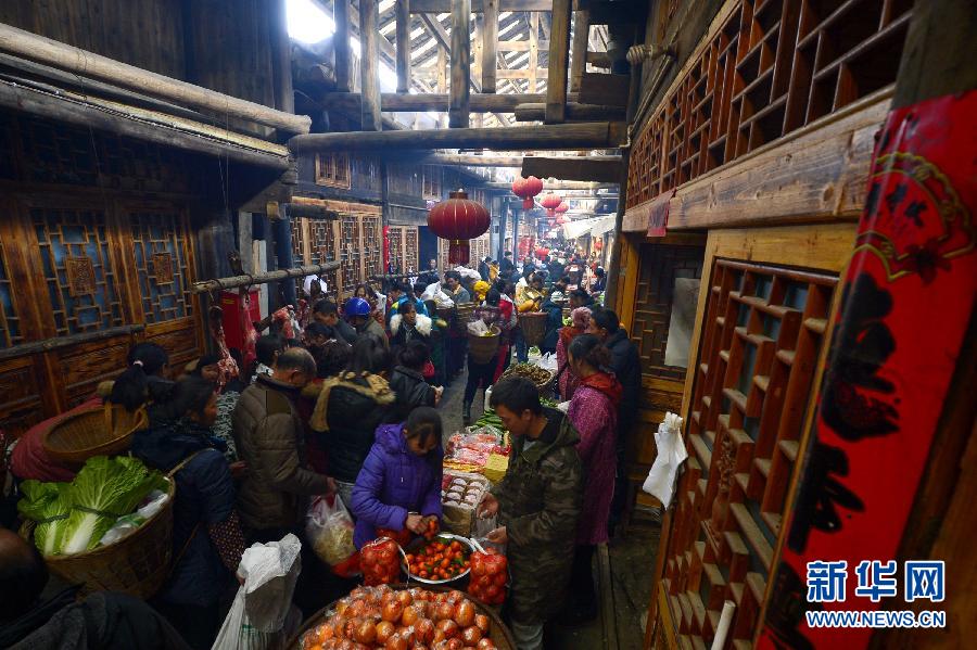 当日是湖北恩施土家族苗族自治州宣恩县庆阳古街春节前的最后一个赶集日,人们从四面八方汇聚于此,为即将到来的羊年储备过年物资。庆阳古街始建于清朝乾隆年间,占地面积2000余平方米,每逢农历二、五、八举行乡村集市。这里是昔日出入湘、鄂、渝“盐花古道”的隘口,在这里可以品味土家族典型的建筑、商贸和集镇文化。新华社发(宋文 摄)