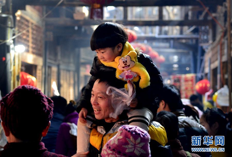 2月13日,阳光透进湖北宣恩庆阳古街,一名小孩被家长扛在肩上在庆阳古街赶集。
