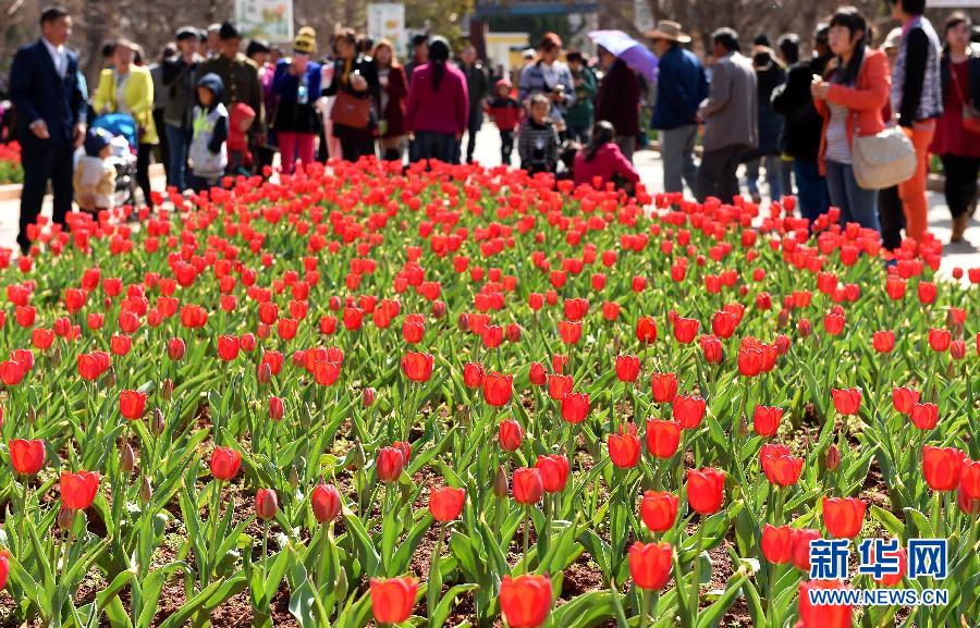 2月19日,市民和游客在昆明翠湖公园里观赏盛开的大片郁金香。当日是农历正月初一,云南省昆明市阳光明媚,最高气温达20摄氏度。各大公园里花团锦簇,鲜花盛开,洋溢着浓厚的节日气氛。人们纷纷走出家门,观花赏景,喜迎春节。新华社记者 蔺以光 摄