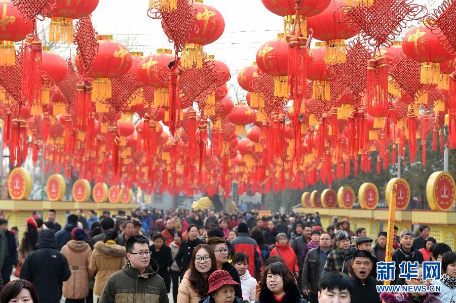 2月19日,游客在庙会上通过红灯笼走廊。当日,主题为“连年有余兆吉瑞 福禄寿喜迎新春”的北京八大处公园新春祈福庙会开幕。 新华社记者李俊东摄