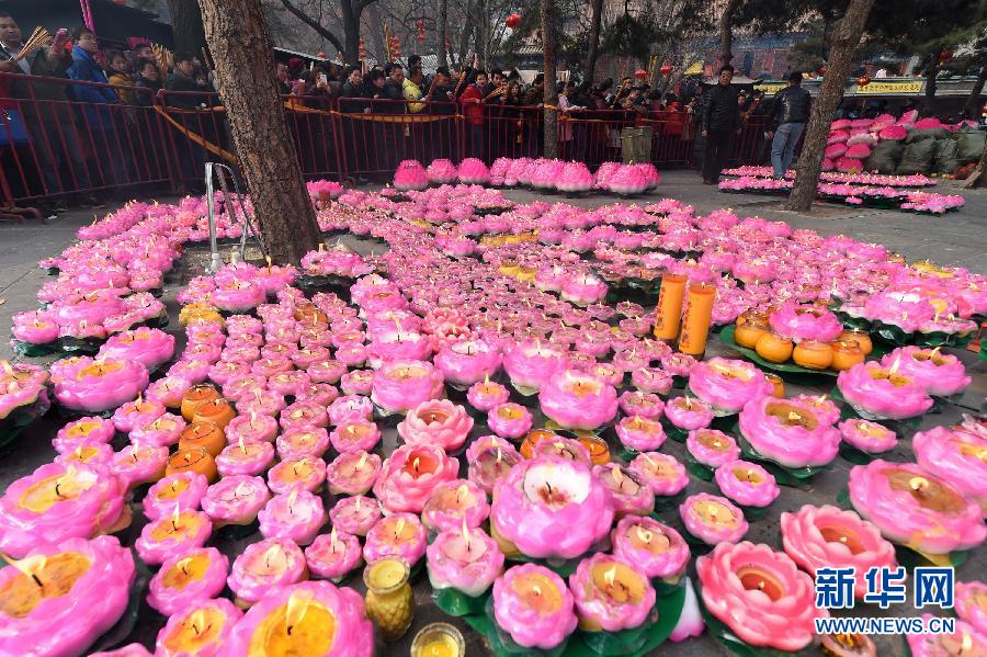 这是2月19日拍摄的游客点燃的祈福莲花灯。当日,主题为“连年有余兆吉瑞 福禄寿喜迎新春”的北京八大处公园新春祈福庙会开幕。 新华社记者李俊东摄