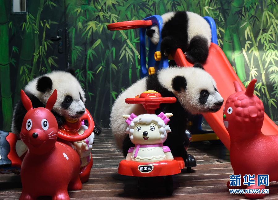 2月18日,长隆野生动物世界的三胞胎大熊猫宝宝与玩具羊玩耍。当日,广州长隆野生动物世界为5个半月大的三胞胎大熊猫宝宝——萌萌、帅帅、酷酷的居室挂春联、布置玩具羊,让大熊猫宝宝也喜气洋洋“过大年”。新华社记者 刘大伟 摄