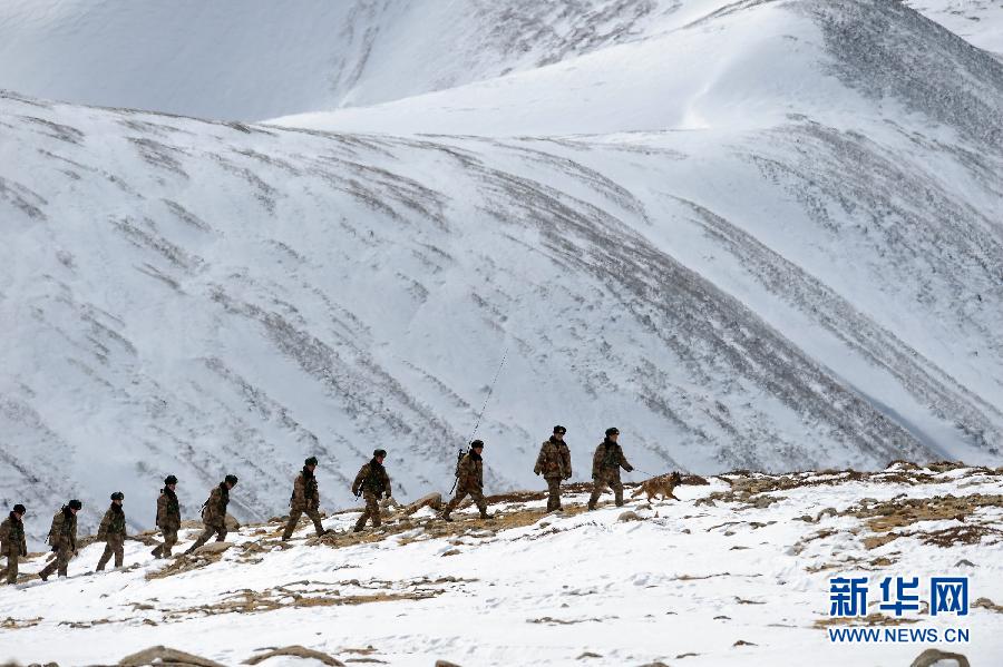 2月18日农历大年三十,扎西岗边防连官兵在海拔5580米的边境线上巡逻。农历大年三十,西藏阿里高原气温骤降至零下21摄氏度,位于喜马拉雅山脉腹地的扎西岗边防连,按计划对海拔5580米的绒隆山口执行巡逻任务。官兵们不畏严寒缺氧,踏雪巡逻,守卫着边境的安宁。新华社发(向文军 摄)