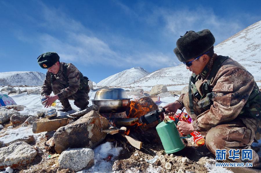 2月18日,扎西岗边防连士官次仁顿珠(右)、王俊融雪烧水为巡逻分队准备午餐。农历大年三十,西藏阿里高原气温骤降至零下21摄氏度,位于喜马拉雅山脉腹地的扎西岗边防连,按计划对海拔5580米的绒隆山口执行巡逻任务。官兵们不畏严寒缺氧,踏雪巡逻,守卫着边境的安宁。新华社发(向文军 摄)
