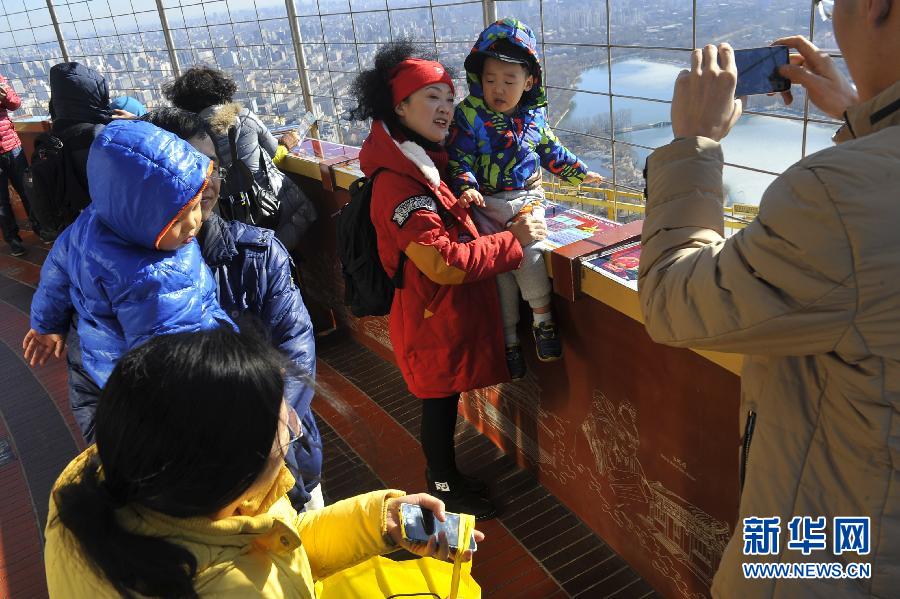2月18日,游客在中央电视塔238米高的露天观景台上观光拍照。当日是农历腊月三十,北京天气晴好,阳光明媚。众多市民和游客来到中央电视塔登高观景,游览拍照,欢度新春佳节。 新华社记者 鲁鹏 摄
