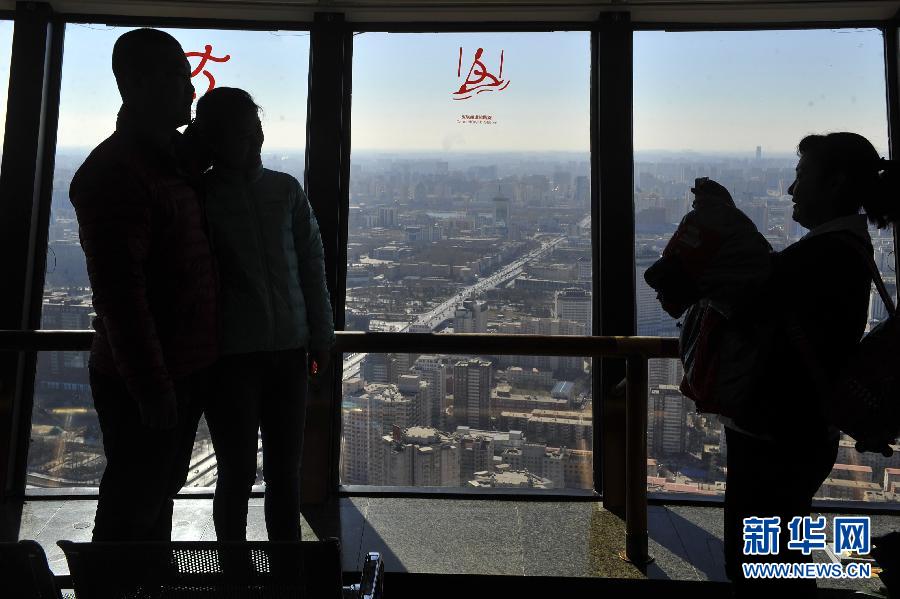2月18日,游客在中央电视塔的电视文化大厅内拍照。当日是农历腊月三十,北京天气晴好,阳光明媚。众多市民和游客来到中央电视塔登高观景,游览拍照,欢度新春佳节。 新华社记者 鲁鹏 摄