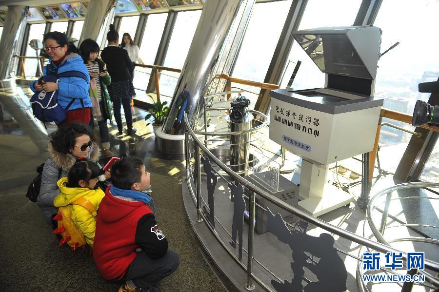 2月18日,游客在中央电视塔的电视文化大厅内参观。当日是农历腊月三十,北京天气晴好,阳光明媚。众多市民和游客来到中央电视塔登高观景,游览拍照,欢度新春佳节。 新华社记者 鲁鹏 摄