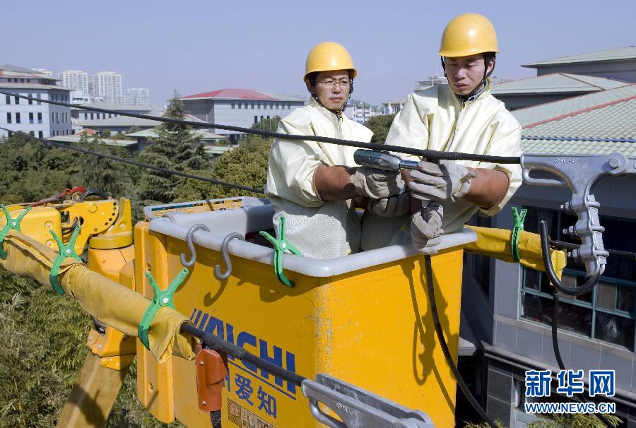 2月18日,国家电网无锡供电公司工作人员在江苏省无锡市长江北路带电作业抢修10千伏线路。当日是农历除夕,全国各地环卫、医护、制造、运输、公安、电力等行业的工作人员仍然坚守在各自的工作岗位上,以特有的方式迎接新年的到来。新华社发(潘正光 摄)