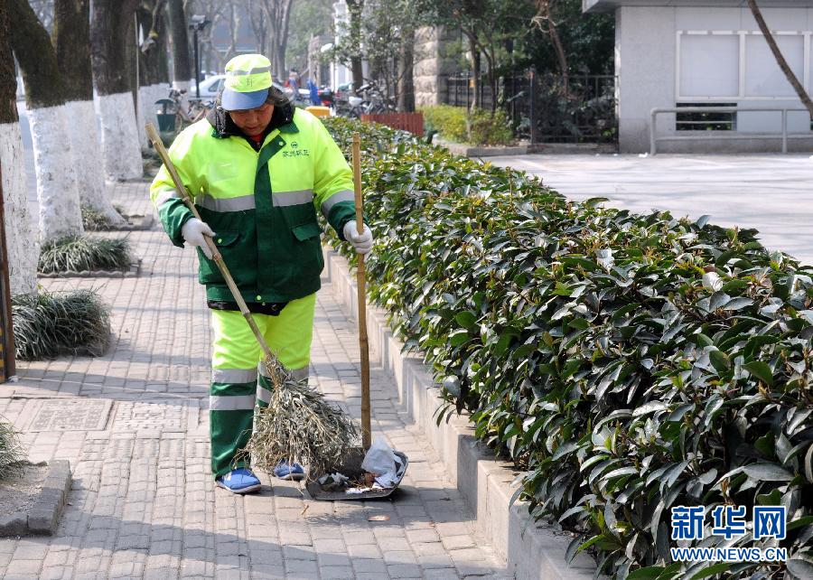 2月18日,环卫工人在江苏省苏州市街头清理路面。当日是农历除夕,全国各地环卫、医护、制造、运输、公安、电力等行业的工作人员仍然坚守在各自的工作岗位上,以特有的方式迎接新年的到来。新华社发(杭兴微 摄)
