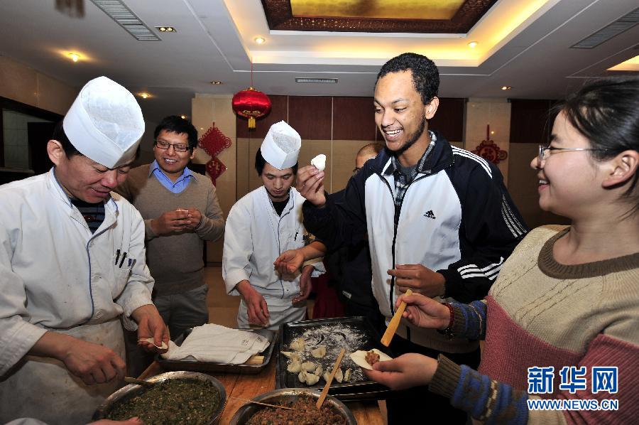 2月17日,埃塞俄比亚留学生纳尔在学习包饺子。当日,北京航空航天大学为30余位留校过年的学生举办师生团圆宴,校长与学生们一起包饺子迎新年。 新华社记者 杨光 摄