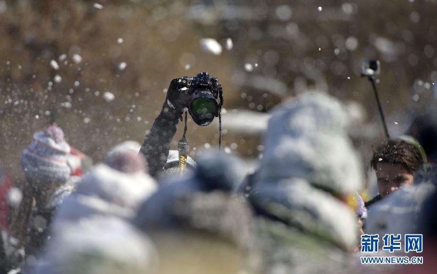 2月17日,人们在美国首都华盛顿的子午线山公园打雪仗。 16日晚至17日凌晨,华盛顿普降大雪,积雪厚度达10至15厘米。华盛顿雪仗协会17日组织数百人参加打雪仗,享受大雪带来的快乐。新华社记者殷博古摄