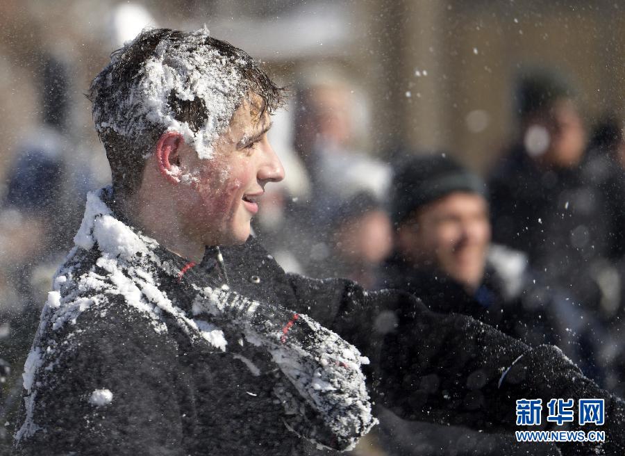 2月17日,人们在美国首都华盛顿的子午线山公园打雪仗。 16日晚至17日凌晨,华盛顿普降大雪,积雪厚度达10至15厘米。华盛顿雪仗协会17日组织数百人参加打雪仗,享受大雪带来的快乐。新华社记者殷博古摄