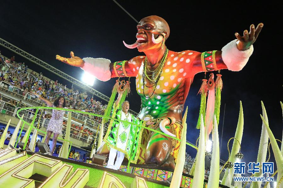 2月17日,在巴西里约热内卢桑巴大道,球星济科(右)参加特级组舞校桑巴游行。当日凌晨,包括卫冕冠军在内的特级组桑巴舞校亮相桑巴大道,将里约热内卢狂欢节推向高潮,狂欢表演一直持续到天明。 新华社记者张强摄