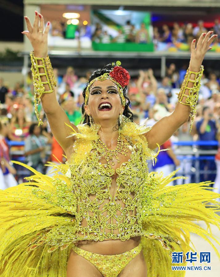 2月17日,在巴西里约热内卢桑巴大道,表演者参加特级组舞校桑巴游行。当日凌晨,包括卫冕冠军在内的特级组桑巴舞校亮相桑巴大道,将里约热内卢狂欢节推向高潮,狂欢表演一直持续到天明。 新华社记者张强摄