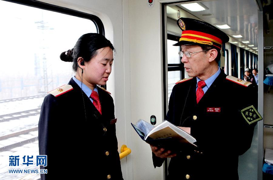 2月16日,锦州客运段广州车队列车长张振民在对乘务员进行岗位责任检查。张振民为铁路客运事业奉献了40年,在担当列车乘务工作中有31个除夕是在工作中度过,无法与家人团聚。张振民今年9月即将退休,他仍然毫不懈怠,兢兢业业地站好最后一班岗,第32次踏上了除夕春运路。新华社发(高锦旭摄)